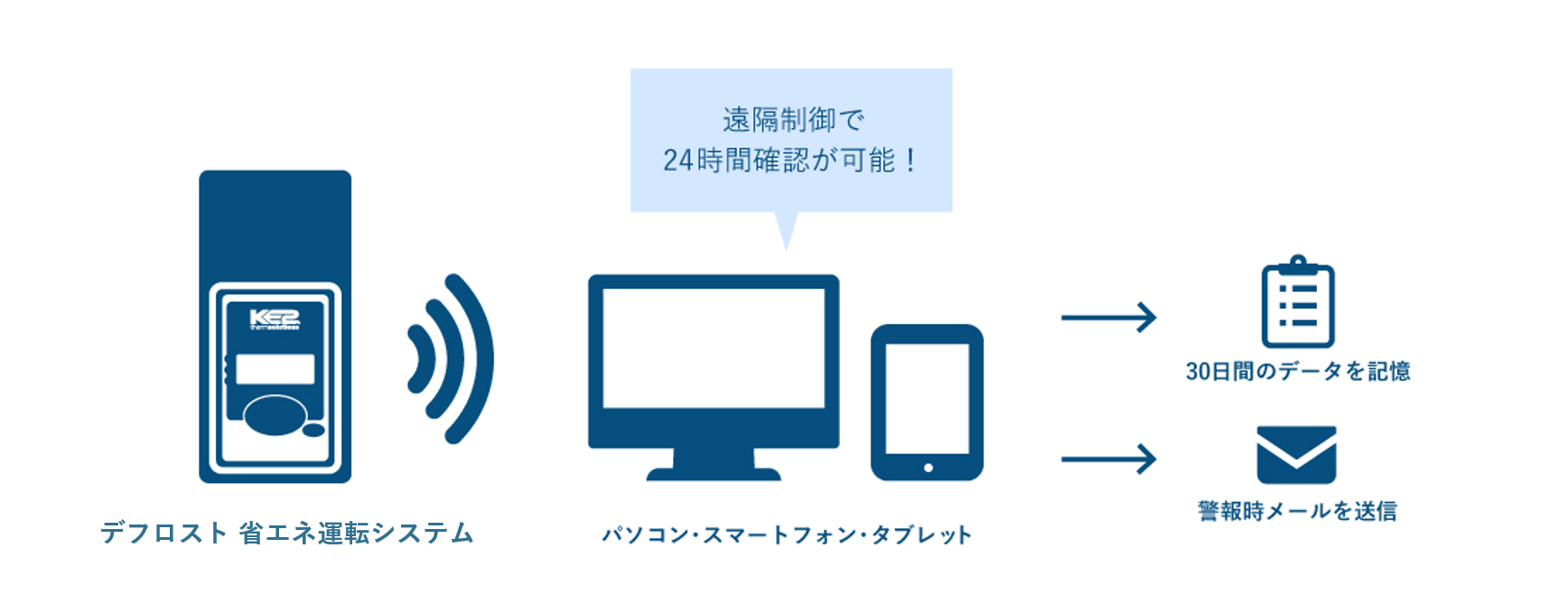 パソコンやスマートフォン、タブレットから、システム状況・霜取回数・庫内温度を24時間確認することができるため、現場へ赴く必要がありません。また、過去30か月の庫内温度等のデータを記憶することができます。