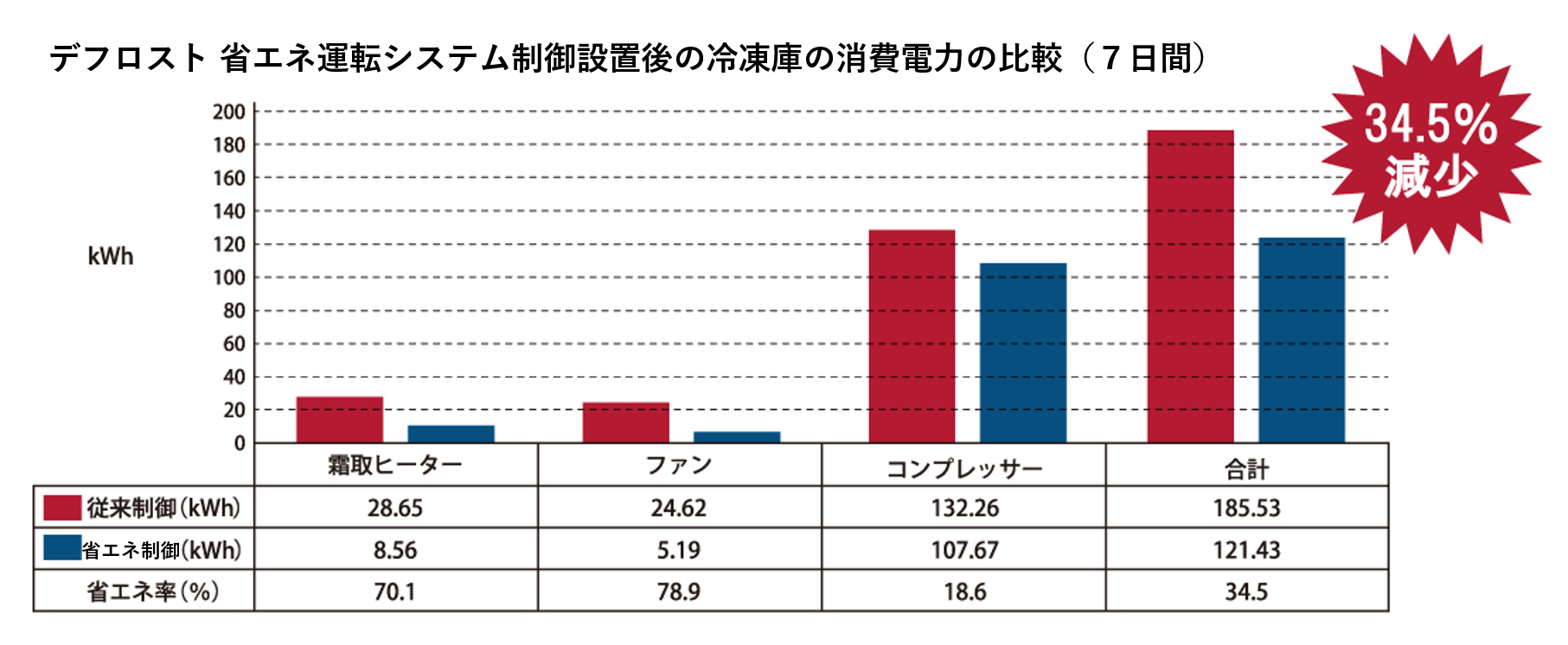 冷凍冷蔵庫デフロスト 省エネ運転システムは冷凍・冷蔵システムに取り付けることで、蒸発器のファンやコンプレッサー、ヒーターの運転をコントロールする制御装置です。